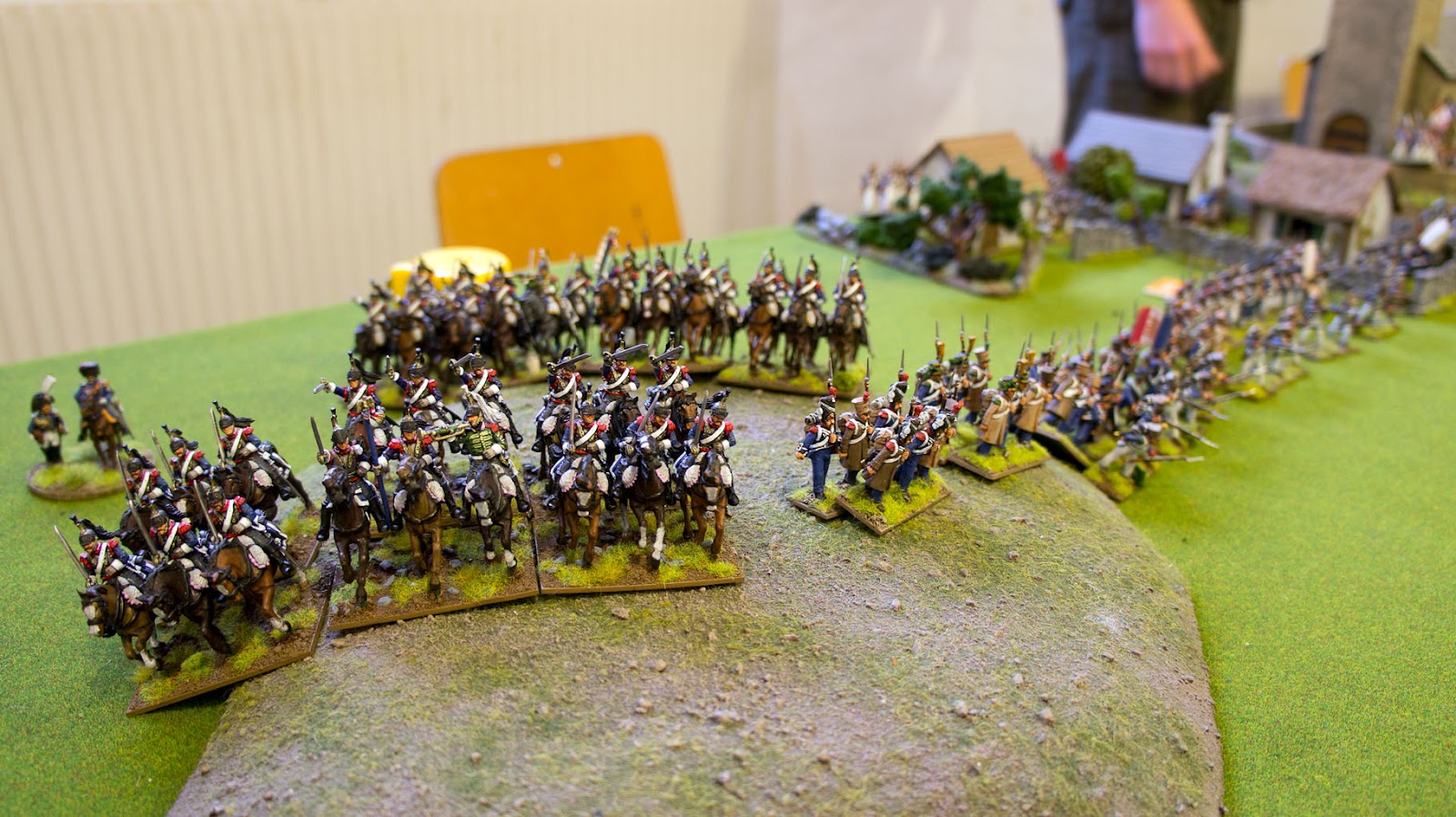 On the French side we had Matsson that took up position in the village, he had a brigade of infantry and two regiments of Cuirassiers in immediate reserves behind the village. Things started out slow on that flank. Tobbe spread out his Prussians in one long line facing the French in the village with the task to just hold out. Erik pushed really hard in the center and his Hussars charged wildly and caused general panic. On the other flank I had some success pushing back two regiments of Landwehr but my Dragoon brigade failed to receive the assault orders to follow up the attack and where shot up badly by Prussian guns. When Eriks flank marching brigade arrived things went down hill rapidly on my flank. Matsson tried desperately to charge home with his Cuirassiers to punish the thin Prussian deployment but spectacularly bad die rolling would not allow it. Later the when the Cuirassiers retreated off the field Mattsson declared their total tally, just one single Prussian model killed.